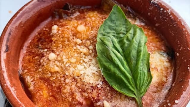 (Passata pomodoro, involtino di melanzane, crema di basilico