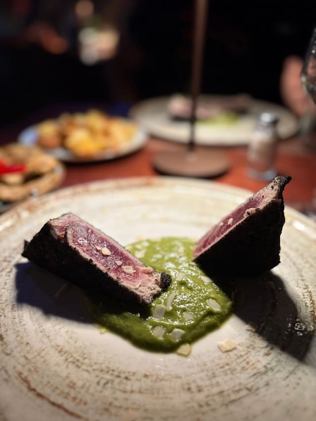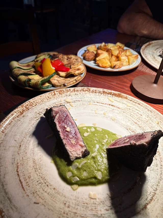 Tonno rosso, fritto con pan grattato al nero di seppia servita con crema di zucchine alla menta e mandorle tostate