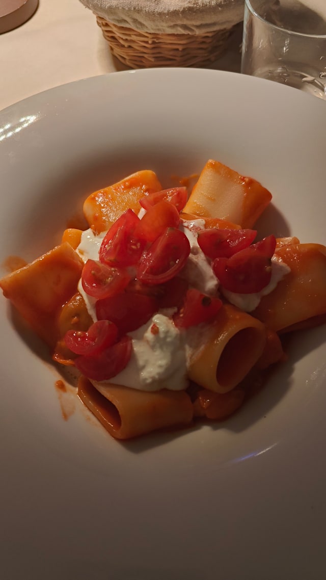 Con pomodorini gialli, pachino, passata di pomodoro e stracciatella