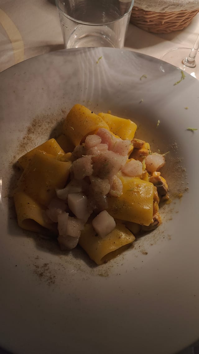 Calamari, cozze, gamberi, pomodorini, pesce crudo del giorno e scorza di lime