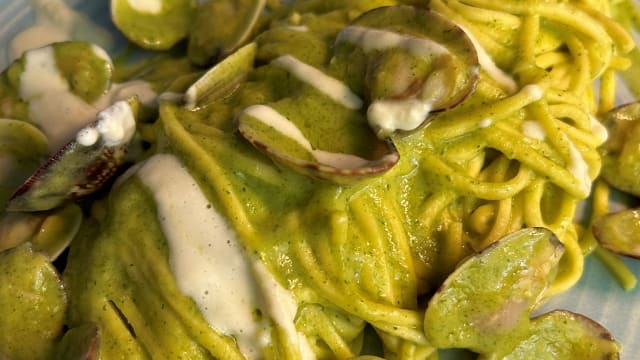 Chitarruccio al pesto di pistacchio, stracciatella di burrata e granella di pistacchio