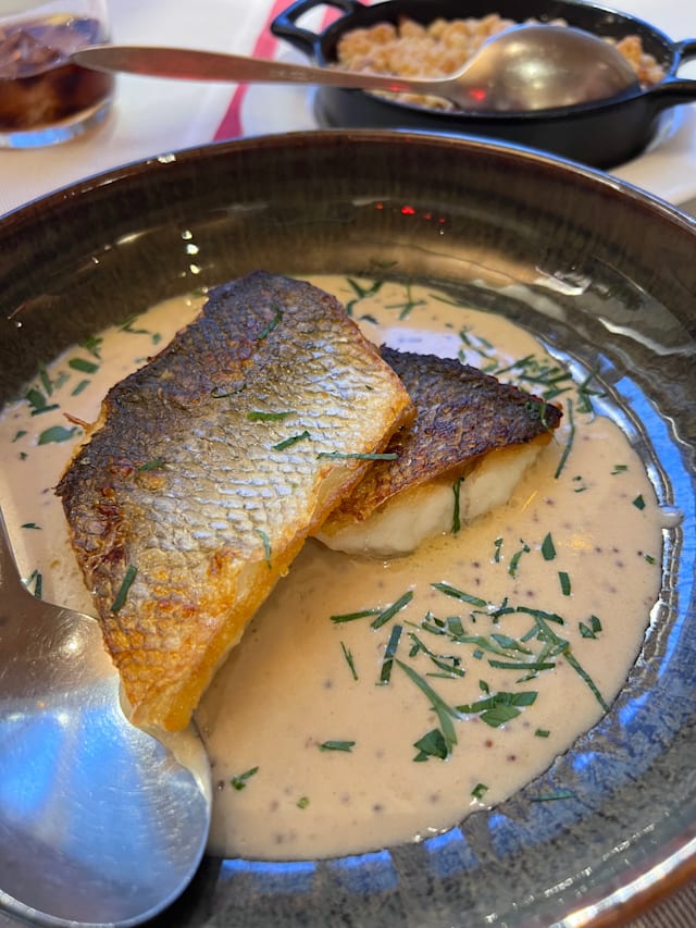 Dos de cabillaud rôti, fricassée d'asperges et fèves, émulsion au chorizo