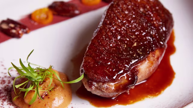 - Pato ailesbury con biscuit de chirivía, manzana agridulce y avellanas