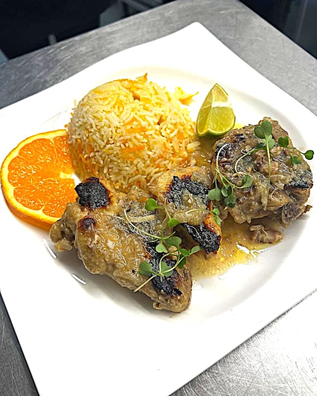 Galinha cafrial com arroz de cenoura