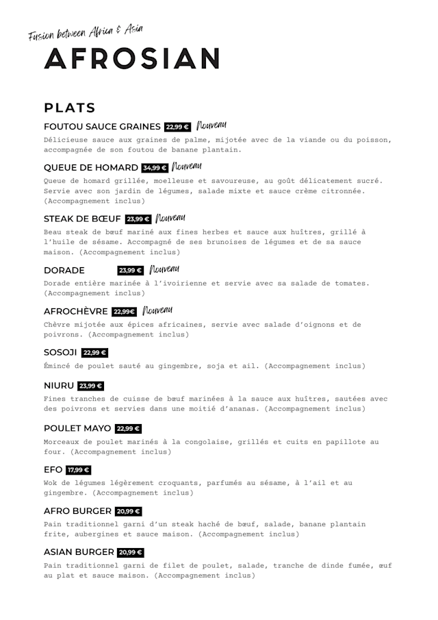 4.5/10The food was very disappointing. Expensive, uninteresting, the burger was just drenched in mayo. No hint of african or asian cuisine besides the fried plantains on the side