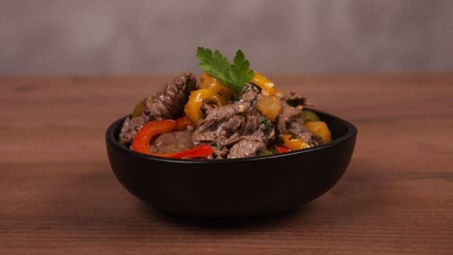 Émincé de boeuf tache noire - poivrons - dés d’ananas(servie dans un ananas)