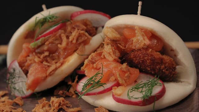 Empanaditas al vapor rellenas de langostinos, acompañadas de salsa teriyaki, spicy mayo y cebollino.