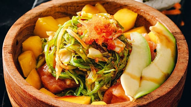 Base de mango y wakame, acompañado de salmón marinado con un topping de aguacate, salsa spicy, masago, sésamo y germinados.