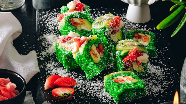Hosomaki apanado de mango, con un topping de queso philadelphia, fresas , sirope de frutos rojos y petazetas.