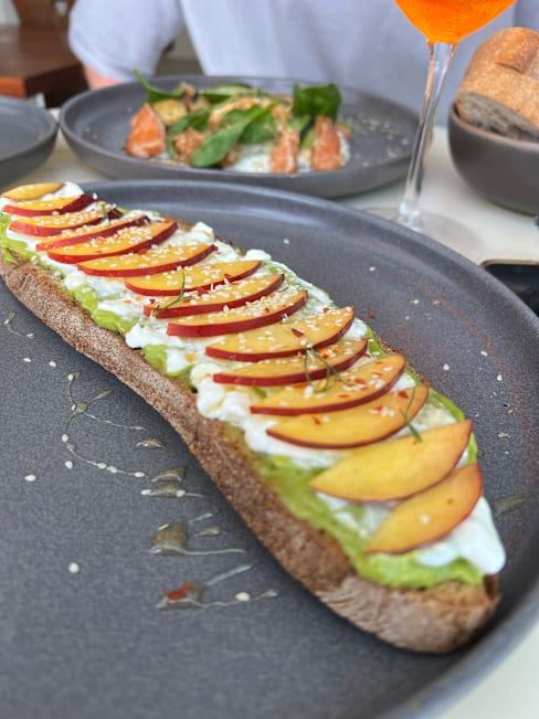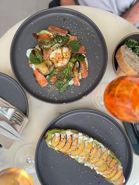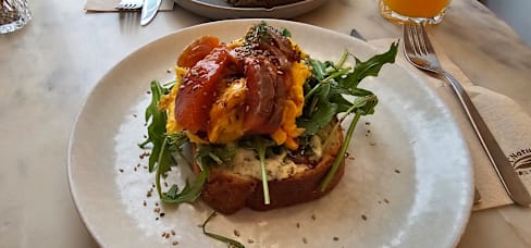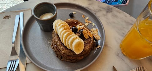 10/10Agora: Where Lisbon Meets the World (for Brunch) I visited Agora for brunch and was thoroughly impressed by the modern and cozy atmosphere. The natural light streaming in created a relaxing ambiance, perfect for a weekend brunch. The decor was an intriguing mix of rustic and modern elements, giving the place a unique charm. It was interesting to note that most of the people there were foreigners, which added to the unique vibe of the place. I ordered the 'Smashing Brioche' with added kimchi salmon and the normal pancakes. The 'Smashing Brioche' was an explosion of flavors! The combination of toasted brioche, avocado, scrambled eggs, tartar sauce, and arugula, complemented by the kimchi salmon, was simply delicious. The pancakes were also tasty and well-prepared. Both dishes were beautifully presented, and the portions were adequate. The service was excellent, with friendly and attentive staff who made us feel welcome. The wait time for food and drinks was reasonable.