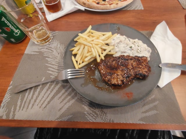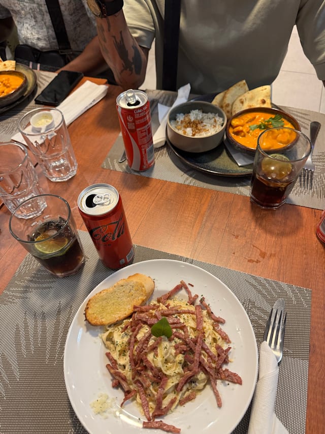 9/10We booked for 3, an hour before going, using the 50% off TheFork deal. They had our table all set & waiting for us. We went at 18:30 & had the whole place to ourselves. For entrees we had cheese sticks, altough they are premade in some food factory the sauce they came with was very good. For our main course we ordered a 4 cheese pizza, it was generous in size for one person & they didn't skimp on the cheese. I ordered a shrimp curry with buttered white rice & garlic naan. It was finger licking gooooood! The right amount of heat, a thick sauce & just enough garlic naan to scoop it all up! Yummy! My husband ordered what he thought was going to be a medium to rare sirloin steak or "bife da vazia", as it was described in the menu, but what he got was thinly sliced rump cap or "picanha", which was well done, not medium to rare. He was quite upset that the cut was not what he thought it would be, but the meat was tender & the seasoning was very good. The indian sauce for the chips was 5*!