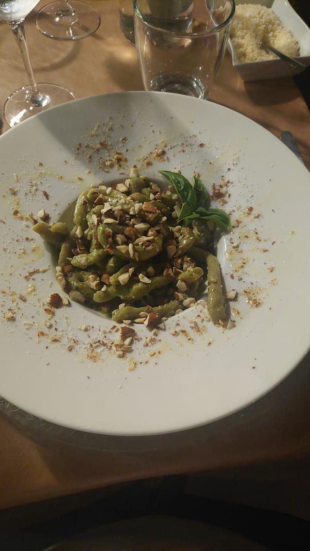 Pici con pesto al basilico senza aglio e mandorle tostate