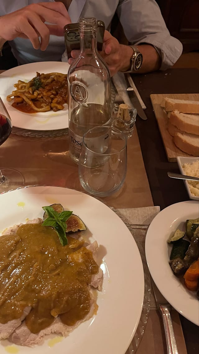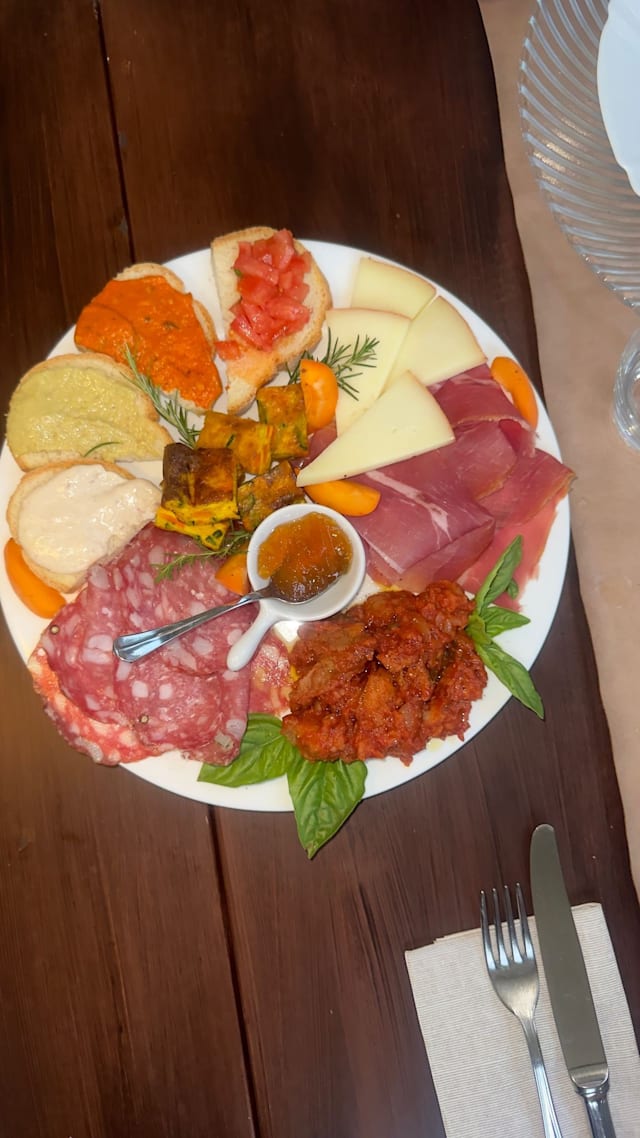 Selezione salumi, frittatine, sformati di verdura di stagione, pappa al pomodoro, crostini e pecorini con marmellate o miele.