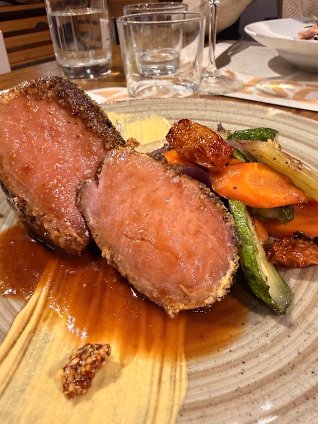 Filetto di maiale cotto a bassa temperatura (km. 31), senape di dijon e guancia di maiale grigio - salsa juss di cottura verdurine stagionali (km. 6)