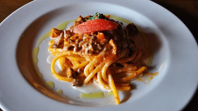 Maccheroncini al torchio con ragù di cortile e pompelmo rosa