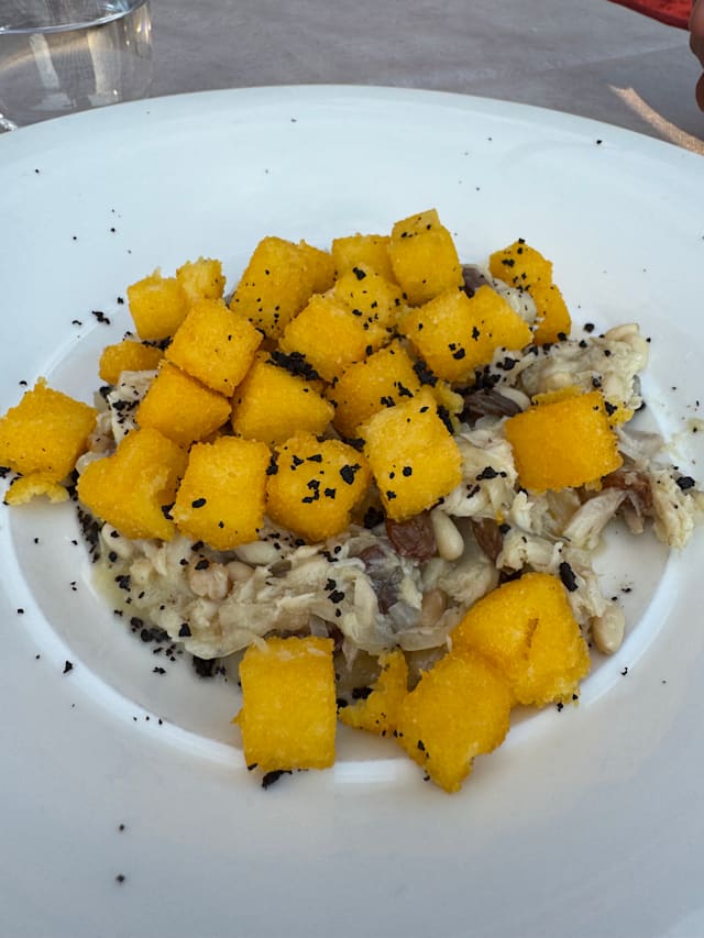 Spaghettone alle sarde di lago con croccante di pane