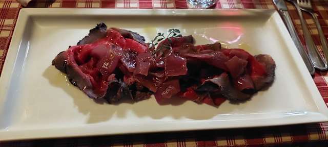 Carpaccio di manzo marinato nel Cabernet con cipolle caramellate