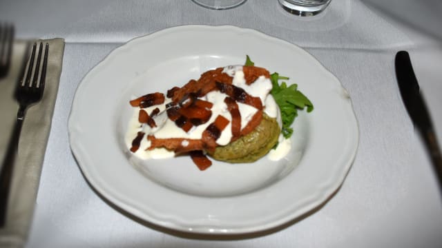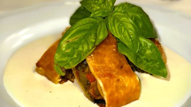 - Flan di verdure del casale su crema di grana e mandorle tostate
