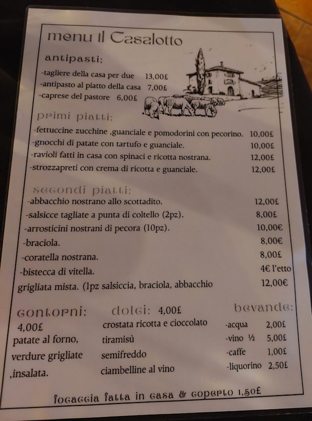 If you plan to eat at Agriturismo "Il Casalotto", the average price should be around €25. The average price is calculated based on appetizer/entrée or entrée/dessert, excluding drinks. Prices have been provided by the restaurant.