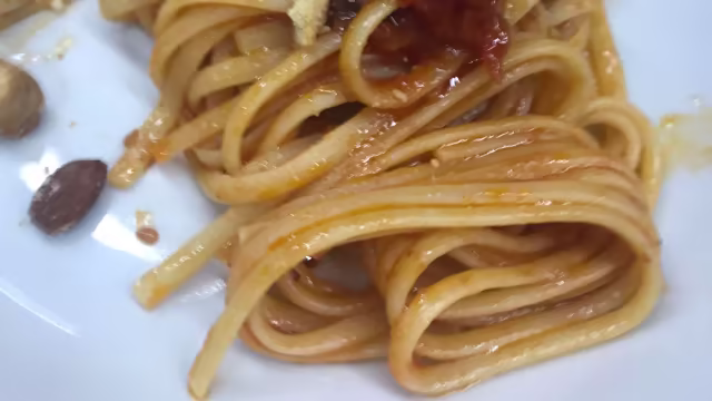 - Trofie (pasta fresca) con patate e provola servite in cialda di parmigiano croccante.