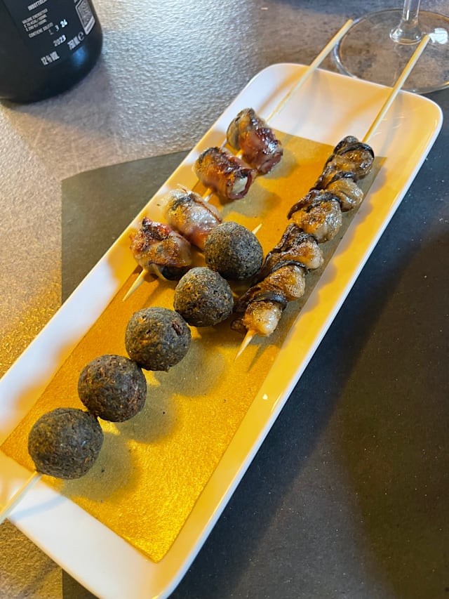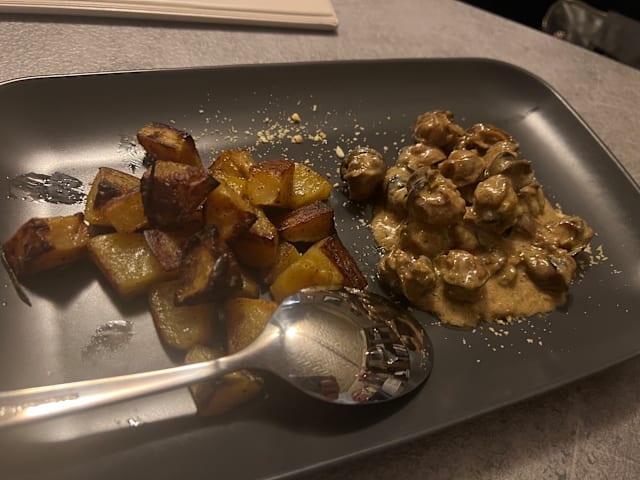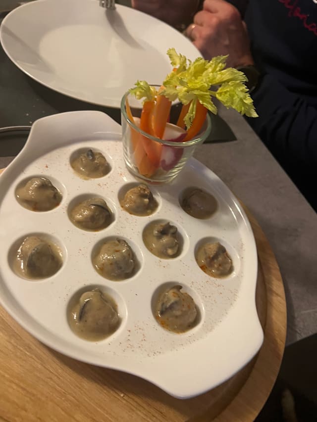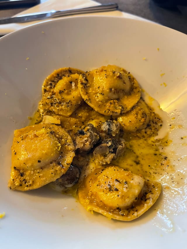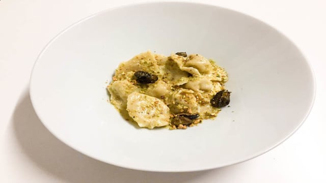 tortelli di patate su fonduta di parmigiano, pesto di salvia e nocciole e lumache alla piastra