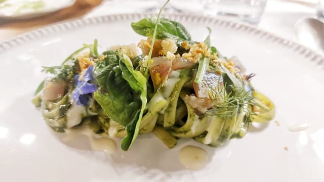Linguine mancini, pesto di erbe selvatiche, pecorino di fossa e alici