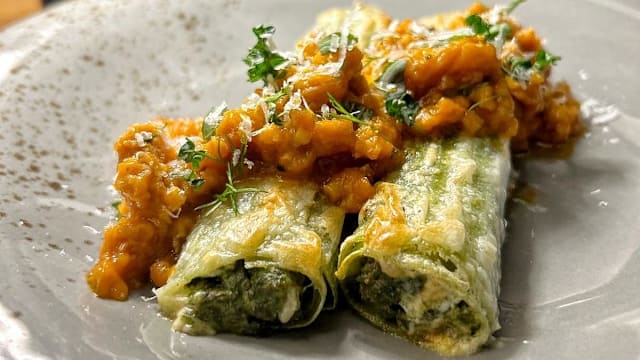Cannelloni di ricotta e ortiche, stracotto di faraona