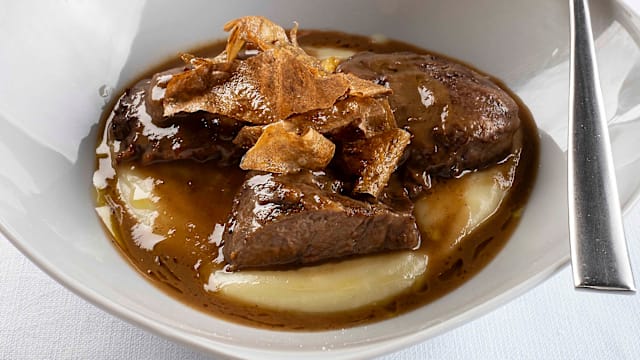 Punta di vitello ripiena con pane, parmigiano reggiano dop e uova, cotta a bassa temperatura nel sauvignon fermo doc lamoretti accompagnata da contorno di patate al forno