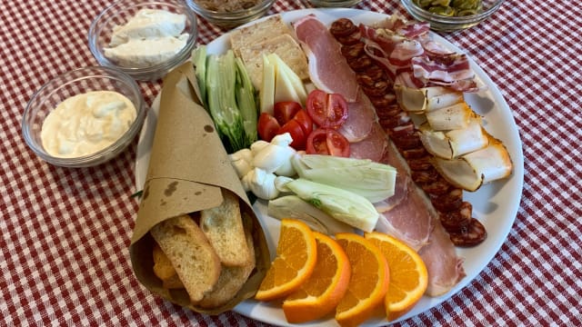 Tagliere misto di salumi, formaggi misti, verdure sott’olio, verdure di stagione e due calici di vino locale