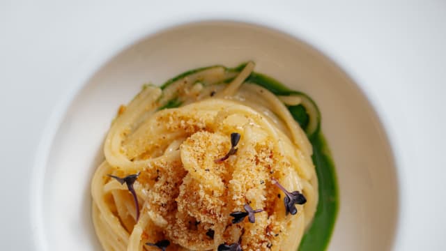 Uovo CBT, crema di finocchi, crumble di pane aromatizzato