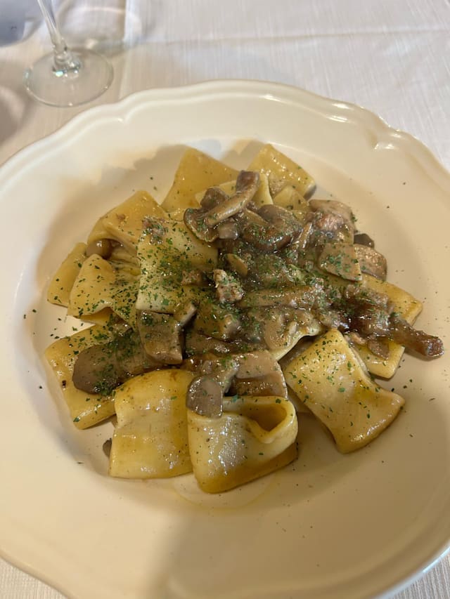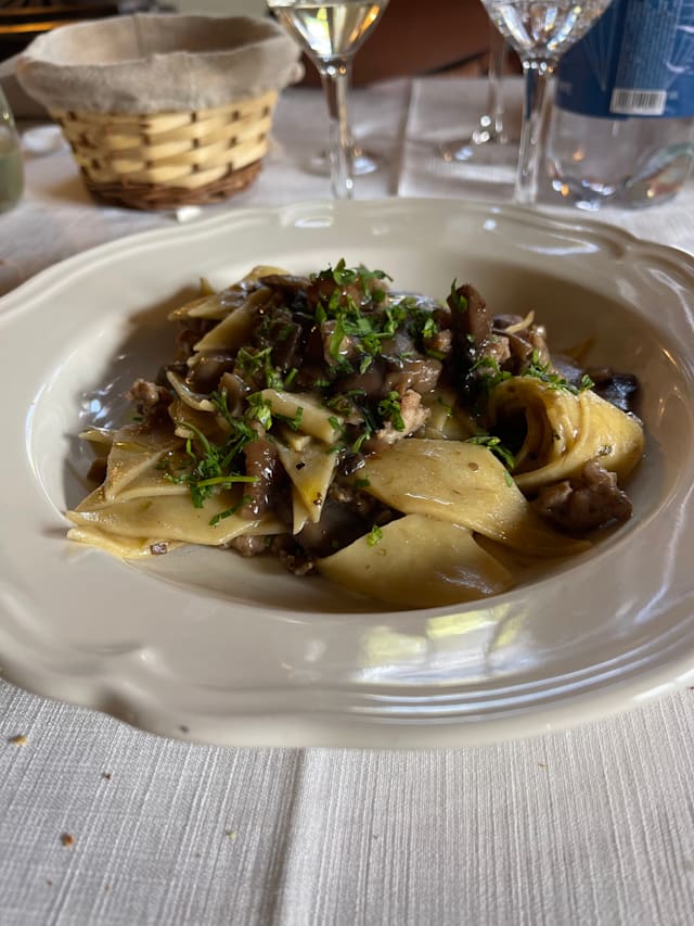 Pasta fresca con uovo, fatta in casa con funghi e salsiccia