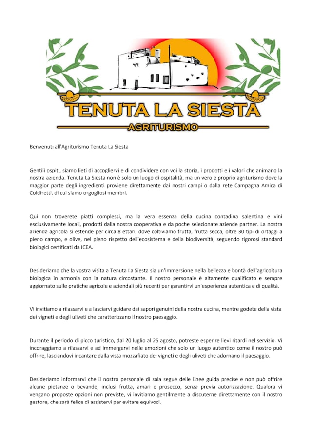 La nostra cucina propone i sapori locali, con qualche rivisitazione nella presentazione delle pietanze. Da noi puoi trovare i piatti autentici della cucina salentina, un excursus tra la tradizione contadina e la tradizione marinara. A Tenuta La Siesta puoi gustare i fantastici piatti della ricca cul...