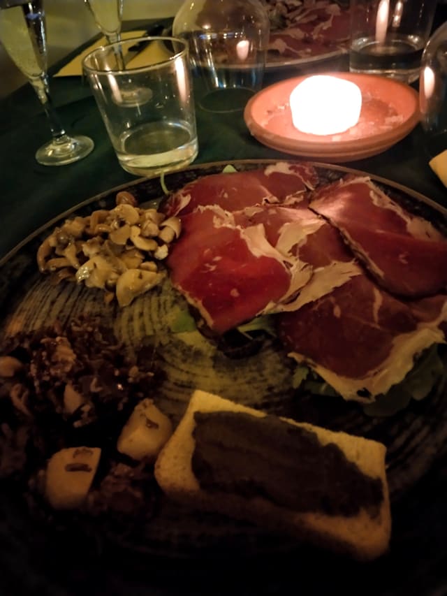 Controfiletto di manzo macerato nei porcini con bruschetta alla salsa di tartufo, e funghi trifolati
