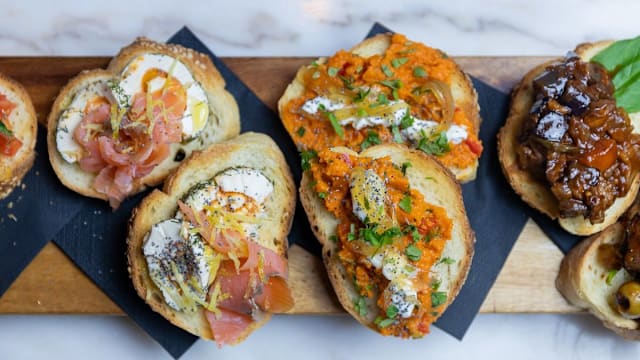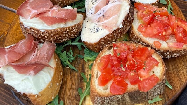 Selezione di bruschette con prodotti tipici e freschi di stagione.