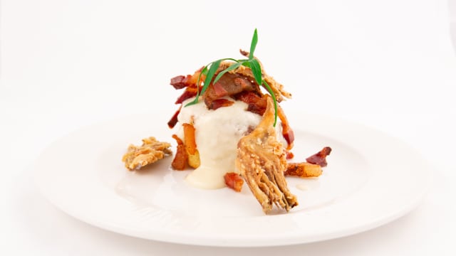 Sformatino di patate con funghi porcini, guanciale croccante su fonduta di pecorino romano