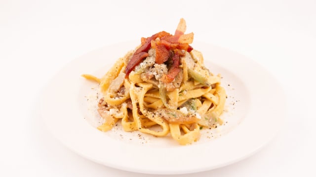 Fettuccine fatte in casa con guanciale, pecorino, pepe, pomodoro pachino e rucola