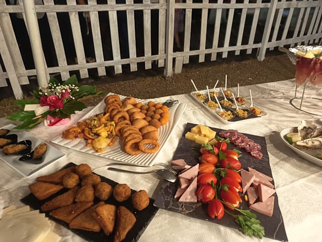 - Polipo, alici, gamberett, salmone, tonno affumicato, asparagi, ostrica, cozze gratinare, involtini spada, tonno in agro dolce, frittura mista, olio extravergine d'oliva, sale, pepe nero, prezzemolo