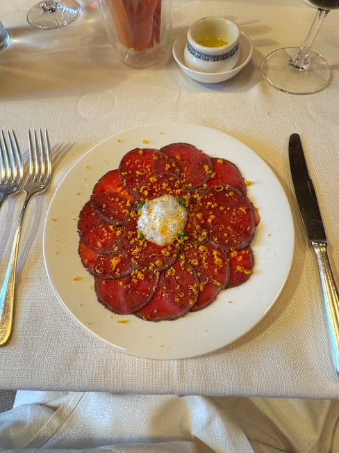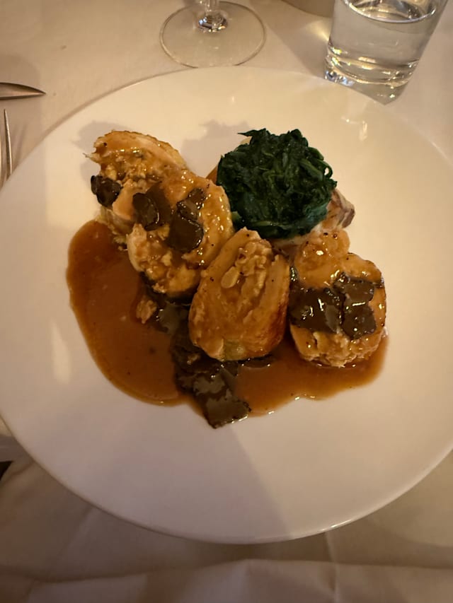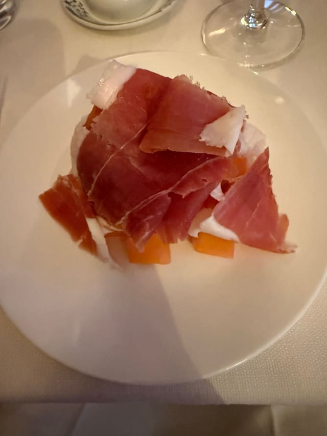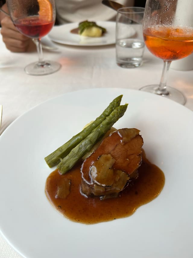 8.5/10Great prix fixe lunch, seven courses, €90. The high point was the potato mousse with a couple of tiny meatballs in tomato sauce on the bottom, but the asparagus risotto was excellent, as was the veal. Wine list is a bit limited, but solid. Service was outstanding, waiter has great English, and very knowledgeable about the menu. Little or no seafood.