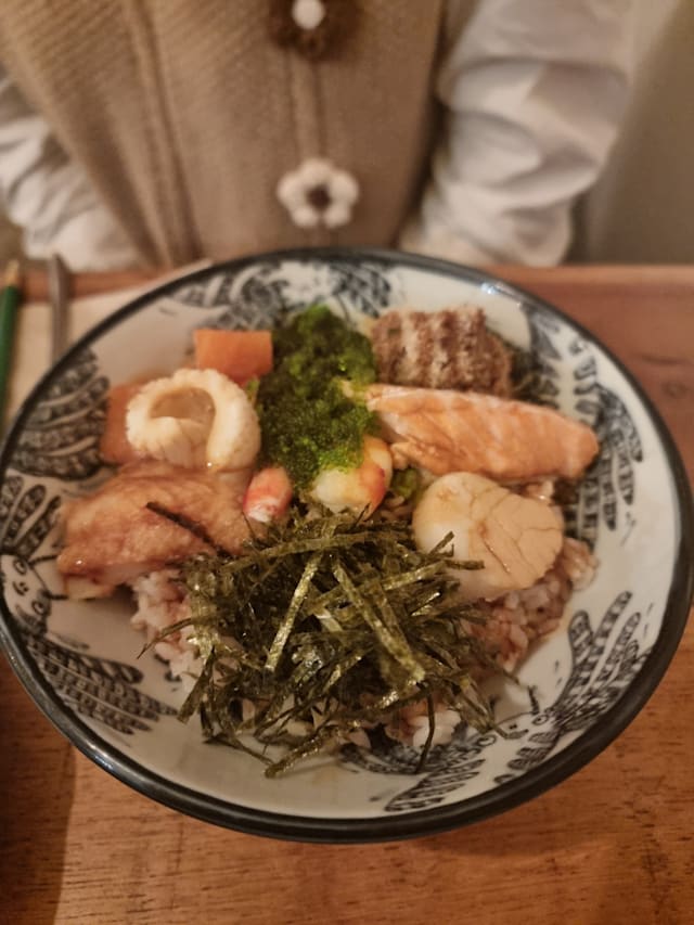 crevette, saint-jacque, calamar, saumon frais, poisson blanc, œufs de poisson volant, avocat, algues, riz, sauce soja fait maison