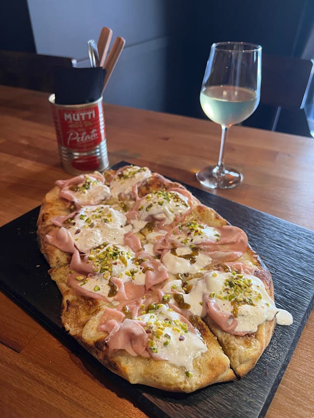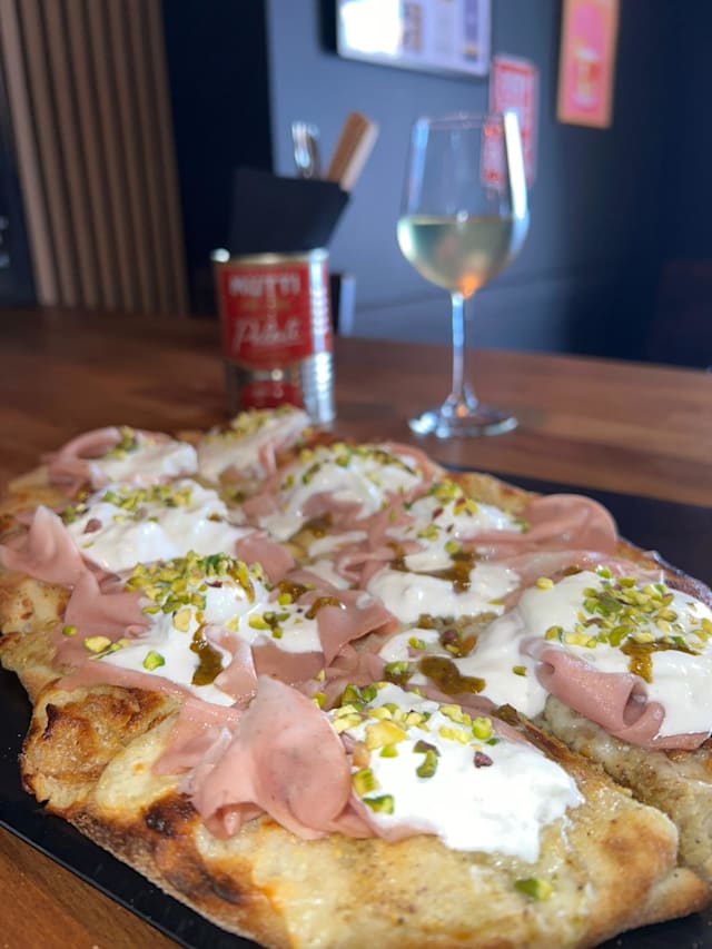 Crème de pistaches, fior di latte, mortadelle, pesto de pistaches, éclat de pistaches, stracciatella