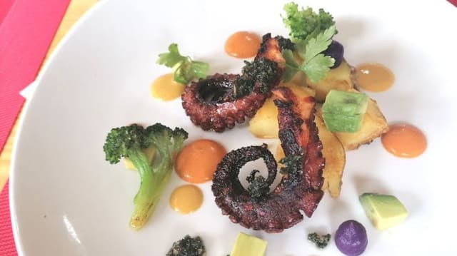 Polvo grelhado com batata, legumes, abacate, banhado com chimichurri andino e molhos peruanos da casa