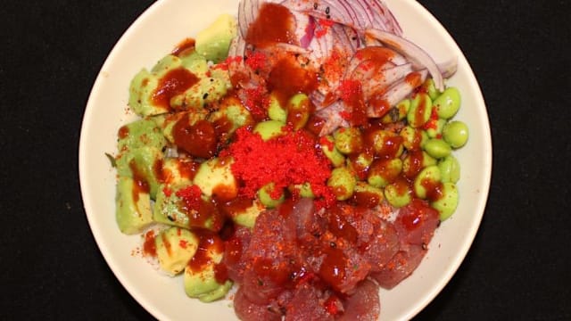 - (With sushi rice,tuna,avocado,edamame,onion, kimuchi,red tobiko,tongarashi)