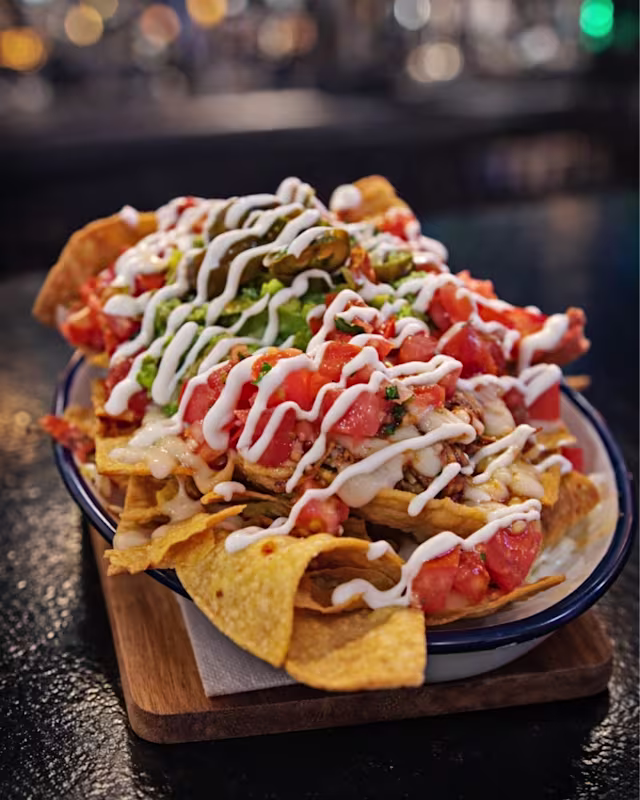 - Tortillas de maíz fritas, frijoles, queso cheddar. Guacamole, pico de gallo, nata agria, jalapeños y gratinados al horno. (proteina a elegir entre pollo, cochinita y barbacoa)