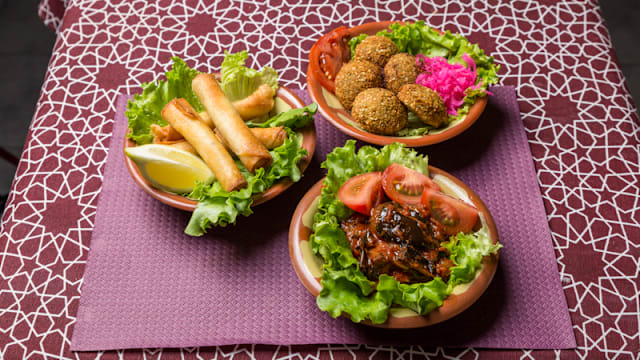A portion of chicken shawerma, one kefta skewer, one falafel served with our special salad and our incomparable hummus!