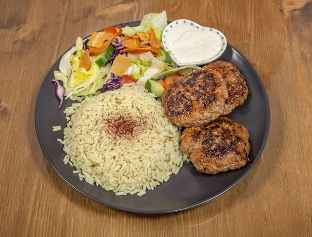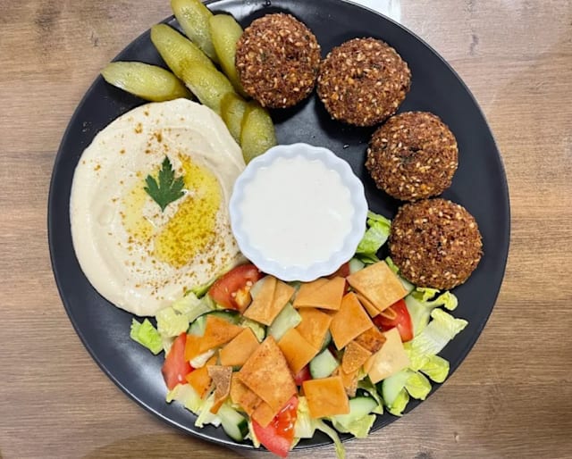 Escalope de poulet, falafels ou merguez, salade, frites, sauce, sirop d’ eau