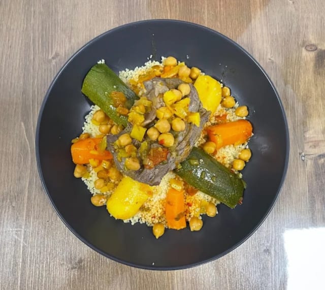 Viande, semoule, pois chiches, carotte, courgettes, tomates, pomme de terre.