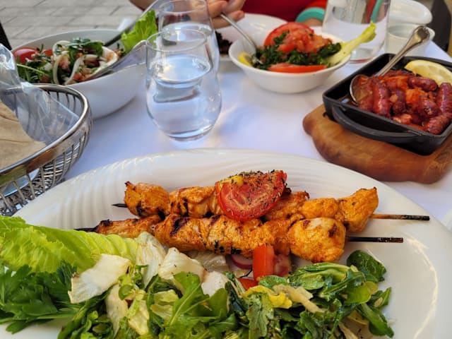 10/10Nice outdoor tables, next to a pedestrian street, on a pleasant summer evening. Professional, warm service. Generous servings of well prepared mezze, very good fish/seafood dishes. Good sized glasses of wine. We liked it a lot.