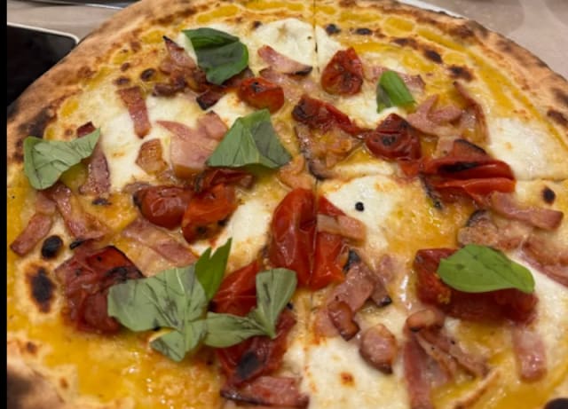 - Crema di datterino giallo, bufala, bacon croccante, pomodoro confit, basilico