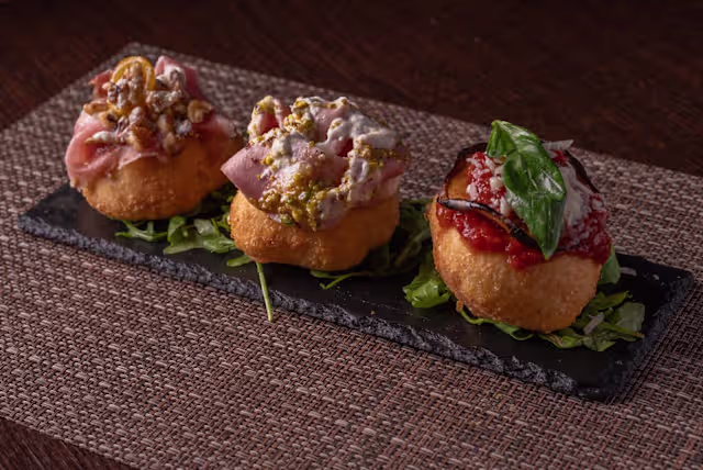 - 1 s.lucia; crudo, stracciatella, datterino giallo confit, noci e miele / 2 parmigiana; polpa di pomodoro, melanzana fritta e scaglie di grana /3 brontella; mortadella, stracciatella, pesto di pistacchio e granella