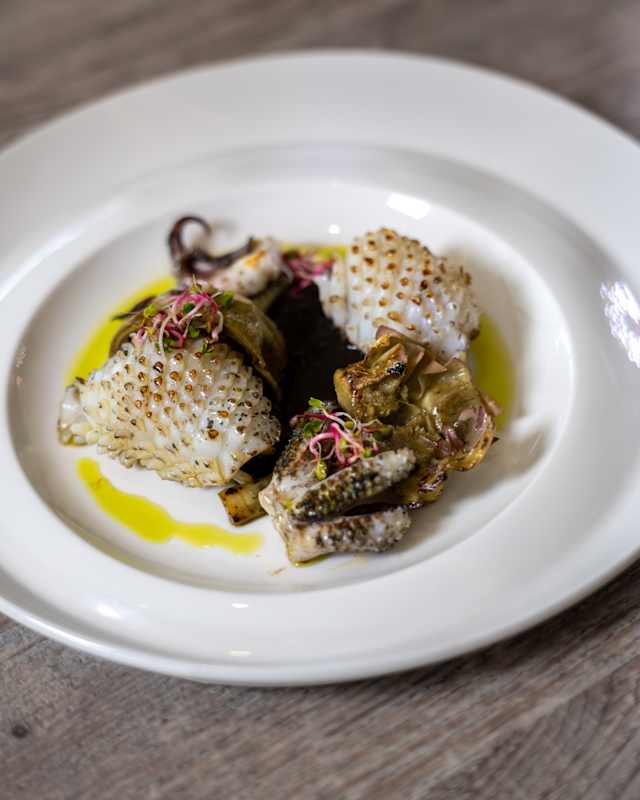 - Pistachio-crusted squid, a mosaic of sour cream, cuttlefish ink sauce, basil creamCrispy octopus, potato foam with Benacus di Torri saffron, sweet-and-sour Tropea red onion, confit Datterino tomatoes